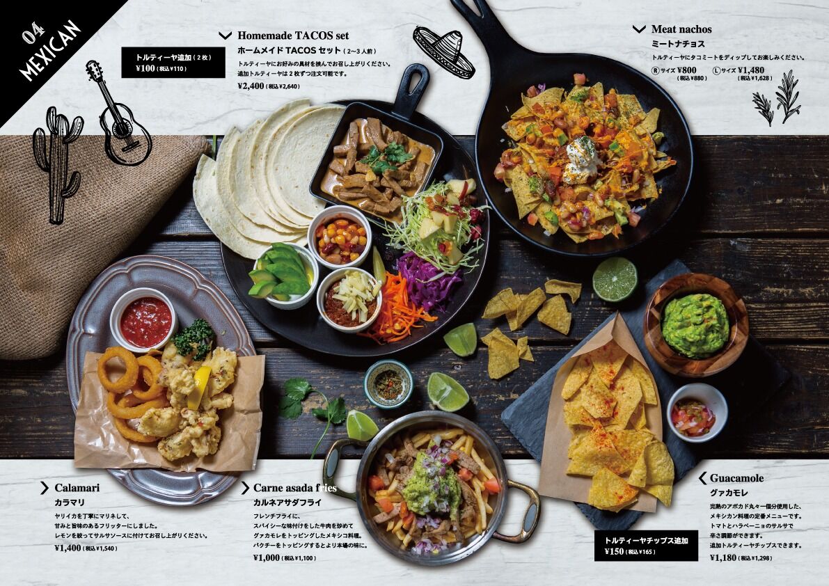 ヴィンテージやモダンな雰囲気がミックスされたブルックリンスタイルの空間は、場所毎に異なる表情を楽しむ事が出来ます。お洒落に楽しめる個室や、女子会にお勧めなテーブル席や、わんちゃんと一緒に過ごせるデッキ席など使い方自由です。